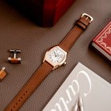 The outer chemin de fer (railway track) indicates minutes and seconds in a case of 43 x 34mm and 10-mm thickness, with comfortable wear because of the slight curve of the case-back. This manual chronograph with operating single pusher (one push to start, two to stop, three to reset) comes on a Saffiano tan leather strap with matching 18K yellow gold pin buckle.