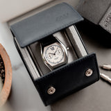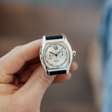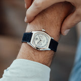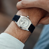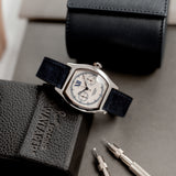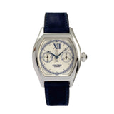 The outer chemin de fer (railway track) indicates minutes and seconds in a case of 43 x 34mm and 10-mm thickness, with comfortable wear because of the slight curve of the caseback. This manual chronograph with operating single pusher (one push to start, two to stop, three to reset) comes on a Mr Watchley Navy blue Nubuck leather strap.