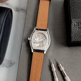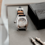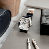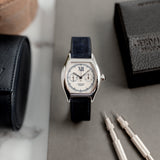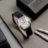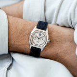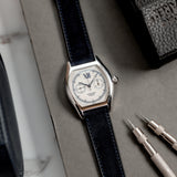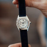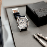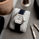 This rare Cartier Tortue Monopoussoir is in very good condition with only small signs of wear (hairlines) and has excellent mechanical functionality. The watch is fitted with a Mr Watchley Nubuck Navy Blue strap