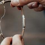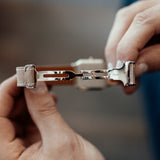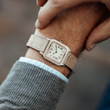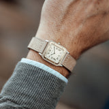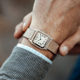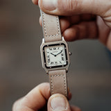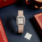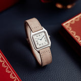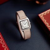 The Santos Dumont is fitted with a nude nubuck strap that contrast well with the silver dial and the blued hands.
