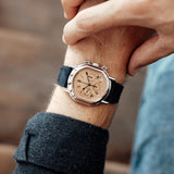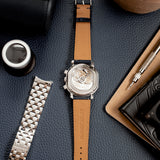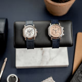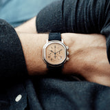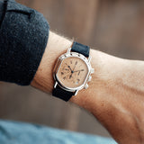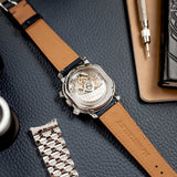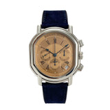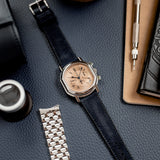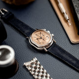 This Daniel Roth Chronograph reference 247 is in mint condition, with only minor signs of wear on the case. It will be delivered with its original Daniel Roth steel bracelet. The watch is fitted with a Mr Watchley Nubuck Navy Blue strap from the Mr Watchley collection.