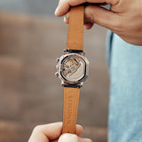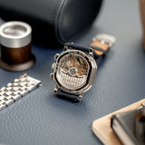 The double-ellipse case made out of steel reflects the signature Daniel Roth statement on the wrist. Having a unique shape – being neither round nor rectangular, yet finely balancing the two. Its caliber measures a traditional 41 mm x 38 mm, equally bold as comfortable to wear with a profile of 11,4 mm thick.