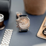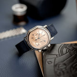 This cult timepiece is further characterised by a high level of finishing featuring the signature pinstripe guilloché pattern. The engraved and rare salmon dial is visually stunning yet highly legible due to its elegant colour contrasts, Roman numerals placed on a brushed chapter ring and blue arrow-shaped hands with a sweep second anchor-shaped hand.