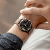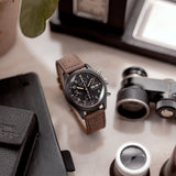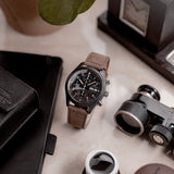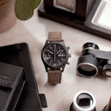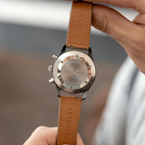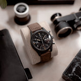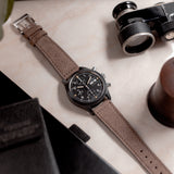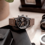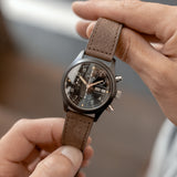 The watch is fitted with the Mr Watchley Nubuck Taupe strap