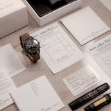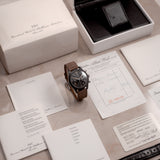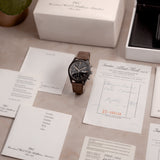 This impressive timepiece is accompanied by an even more impressive full set. The set consists of; outer box, inner box, warranty card, warranty booklet, service booklet, unworn original IWC strap, original purchase papers, envelope, and original IWC pin buckle. This is a seldom seen opportunity to add such a phenomenal timepiece in NOS condition, paired with an extensive full set, to the collection.