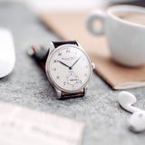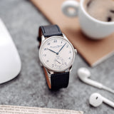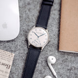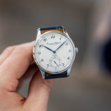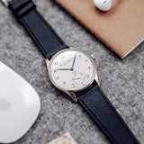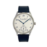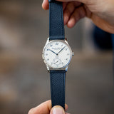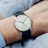 Essentially identical in most respects to the previous Portugueses, the Pisa differed from the Jubilee only in dial appearance. Inspired by IWC’s pocket watches, has blue Breguet numerals that perfectly match the leaf hands, blued with burnish technique, and the Pisa logo applied on it.