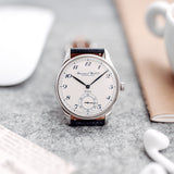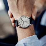 The manufacture movement with manual winding is enclosed in a 42mm steel case and the sapphire caseback gives you a large view on the Caliber 9828 (inspired by the original IWC caliber 98 from 1944) with its special "Pisa" and limited number engraving.