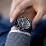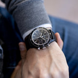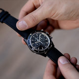 This three-counter chronograph movement takes its aesthetic inspiration from the the 1959 Memovox Deep Sea model. The chronograph operating indicator is inspired by the Jaeger-LeCoultre 1930s “chronoflight” onboard instrument. A diver needs to be able to see at a glance whether the disc shows that the chronograph is ready for use (white), in operation (white/red) or stopped (red). Its high-tech case is made of reinforced cermet.