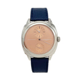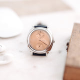 The dial is brushed and is red-gold toned or salmon as we would call it. The dial features the hours at 12, the minutes in the center and a small second at 6. The dial features also an outer, white coloured, printed minute tracker along with the "Regulateur" and the brands logo.