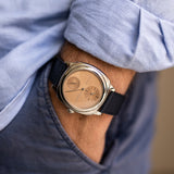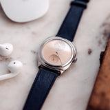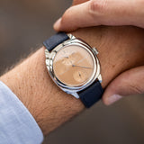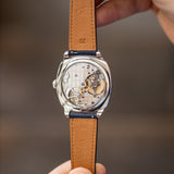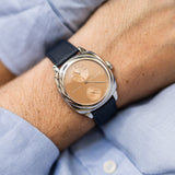 The objective of the Galet Square is to have a presence on the wrist, whilst maintaining the classic “pebble” design from which the watch is inspired. The case is polished in a mirror finish and the crown is engraved.