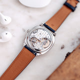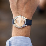 Flipping the watch over reveals the distinctive, and beautifully finished automatic LF 228.01 movement with gold micro-rotor and perfectly chamfered bridges. Impressively, the Laurent Ferrier Galet Micro-Rotor has a double direct-impulse escapement, that improves the movement through its ability to use less power and maintain amplitude and has a power reserve of 72 hours.