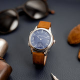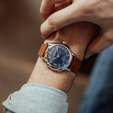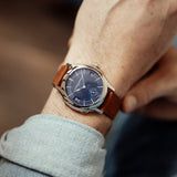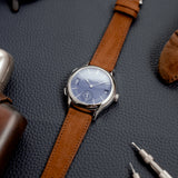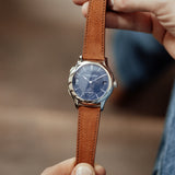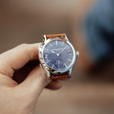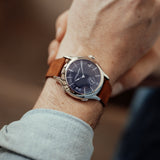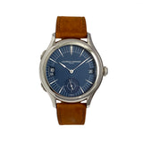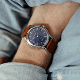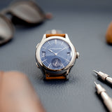 This Laurent Ferrier Galet Traveller is a piece unique, made to measure on the wrist, being the only piece in the world produced in this configuration. The Galet Traveller features a dual-time display with extraordinary readability with its pure design in its 41 mm steel case. The custom made satiné blue dial is further enhanced by a ton sur ton second time subdial and a date aperture at 3 o’clock, with automatically date changing at midnight, elegantly contrasted by its white gold markers and Assegai-Shaped hands.