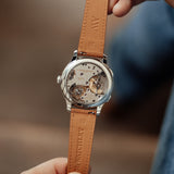 The Laurent Ferrier Galet Traveller is powered by an in-house, self-winding LF230.02 automatic caliber with a renowned micro-rotor winding mechanism with natural escapement, showcasing the architecture of the movement completely. This caliber was designed for the dual-time adjustment mechanism, known for its two-year development period to incorporate the complication.