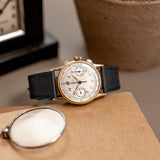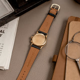 Dating from 1943, this Patek Philippe 130 is a quintessential example of the important reference fitted with an original dial featuring gold Breguet numerals. Measuring a compact 33 mm in width, its 18-carat yellow gold case may sound small, however, thanks to its long lugs, the piece is comparable to a 36mm watch on the wrist. Its exterior is tastefully restrained with soft curvaceous lines in a polished finish, complete with a small stepped bezel surrounding the dial aperture producing subtle depth and ensuring the eye firmly is attracted to its sophisticated dial.