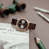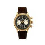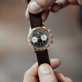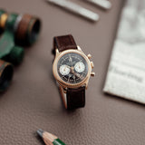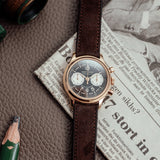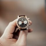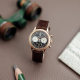 The design has a two-register chronograph and a combination of a black sector-dial and a reversed panda dial. The dial is painted with luminous Arabic numerals and minute markers, which add a nice contrast against the black dial and compliment well the creamy white sub-registers. The feuilles-shaped hands are rose gold and filled with luminous material.