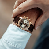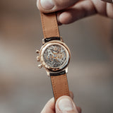 The watch is fitted with a suede brown strap that contrast well with the dial and the pink gold case.
