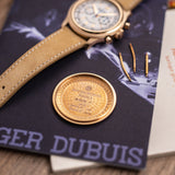 This Roger Dubuis Hommage Chronograph H40 is accompanied by a rare full set. Box, papers, second caseback with engraved numbers, geneva seal tag and an extra Roger Dubuis strap