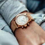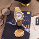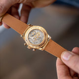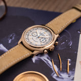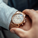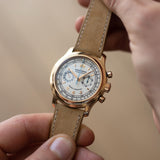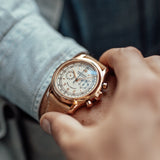 The case is very distinct with its polished, concave bezel and polished lugs. The beauty and complexity of the movement is revealed through an engraved sapphire case-back, powered by the calibre RD56 that is based on the Lemania 2310, like the Patek Philippe 5070 or even like the Vacheron Constantin 47101.