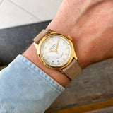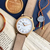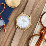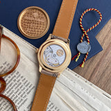 The pink gold case is very distinct with its polished, concave bezel and brushed lugs. The body structure gives the watch a larger impression on the wrist than the 37 mm case would normally do.