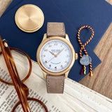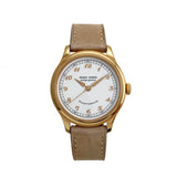 The dial is white enamel with gold polished Breguet numerals. An outer black printed minute and second tracker contrasts well against the white texture along with the gold arrow-head hands.