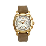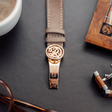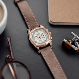 The design of the Chronograph has a gloss-dial and applied Breguet numerals. The polished surfaces and black-printed detailing contrast well against the Ivory dial.