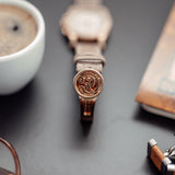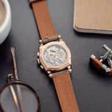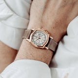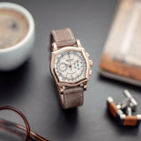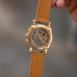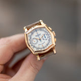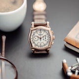 The feuilles hands are rose gold, with two matching blued hands for the chronograph and 30-minute register. The 34mm square case features an array of polished and brushed surfaces, with a stepped-bezel, polished lugs and over-sized screw attachments. The beauty and complexity of the movement is revealed through an engraved sapphire case-back, powered by the calibre RD56 that is based on the Lemania 2310, like the Patek Philippe 5070 or even like the Vacheron Constantin 47101.