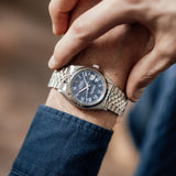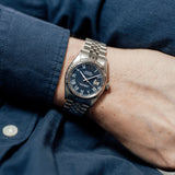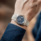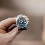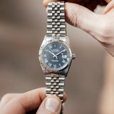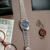 This Rolex Datejust 16014 from 1978 in stainless steel has a very rare blue ‘Buckley’ dial, featuring its signature printed Roman numerals in contrasting classic white with luminescent dots above. The Buckley dial, named after the renowned vintage watch dealer John Buckley in New York (who had a love for the scarcely crafted dial, despite its lack of popularity at the time), is mostly found on vintage Datejust models from the seventies and eighties – the 16014 was one of the few styles favorited to depict it.