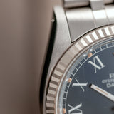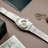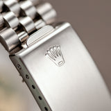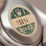 The stainless steel case with white gold flutter bezel has a diameter of 36mm excluding the winding crown. The watch dial showcases a second hand, an outer minute/seconds track in white and aperture for the date. An anti-reflective cyclops lens over the date window enhances ease of reading. The case, dial, movement, crown and folding clasp of the steel jubilee bracelet are Rolex signed. The mythical watch has the original Rolex back sticker still on its caseback.