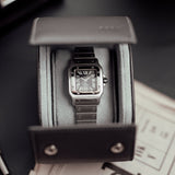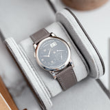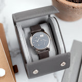 The leather travel case by Mr Watchley is designed to carry one watch. The watch case is made from the super resilient, scratch resistent and easy to clean Saffiano leather. The interior is made from suede-lined, to guarantee the best protection against scratches. The watch cushion can easily be removed in order to install and remove your watch simply and quickly. The travel case closes thanks to two discrete snap fasteners, making it a clean and elegant way to store your watch safely.