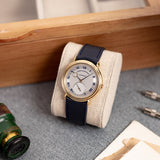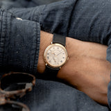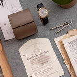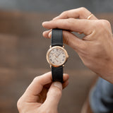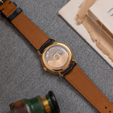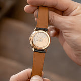 The watch is powered by the automatic Caliber 1160, an ultra-thin movement that is produced by Frédéric Piguet. It contains 30 jewels, has a power reserve of 100 hours and a frequency of 21,600 vph. While the movement may not be in-house in construction, it has been adorned with Urban Jürgensen's attentive in-house curation. Through the sapphire glass exhibition caseback, this considered curation is displayed. Geneva stripes and anglage can be seen on the bridges, while the 21K yellow gold rotor is almost completely covered in very delicate guilloché and is neatly completed with the UJS crest.