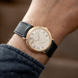 A watch that wears as if it were always just 'meant to be'. With its slender dimensions, slim stepped bezel and decidedly elegant teardrop lugs, the watch blends flawlessly with the wrist and is incredibly comfortable to wear. Its classical form, as well as classical colour palette, make it a distinctly versatile dress watch.