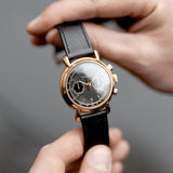 Sometimes watches can either be all about the case or all about the dial. It’s not uncommon for one to steal the show while the other quietly takes a back seat to elevate the other further. Well with this 47101 we’re fortunate to be blessed with both case and dial sharing the limelight. It starts with its teardrop lugs which are respectfully styled after the set found on the 4178, providing early signs of whimsical character. Complete in solid yellow gold they give the feeling of undisputed opulence, only to be complemented by a slender case band with a traditionally style chamfered bezel. A well-sized crown and smooth, rounded rectangular pushers occupy the right-hand side of the case operating the chronograph movement inside. Measuring 36mm across, the piece has a fantastic wrist presence thanks to those unmissable lugs and refined detail. Speaking of refinement...