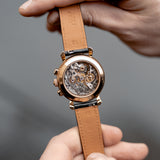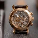 Powering this magnificent art piece is the Vacheron cal. 1140 which is a thoroughly finished evolution of the important Lemania 2310. This nickel-finished movement comes with 21 jewels, a self-compensating Breguet spring, a swan-neck regulator and is adjusted to 5 positions. Enjoy the chamfering and finishing in all its beauty through the sapphire display case back fitted to this Vacheron Constantin Les Historiques Chronograph.