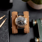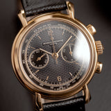 Commonly referred to as one of the most beautifully designed dials ever produced, this 47101 exquisitely delivers a dignified bi-compax dial layout with an overriding air of poised restraint. Its tachymeter scale frames the whole dial with the assistance of the outer five-minute divisions. A gold band separates the two scales aiding readability and raising the balance of the dial, subtly. Taking a further step into the dial are gracefully sized baton hour markers with the 12 and 6 in Arabic font. The three and nine markers have been replaced for the thirty-minute and sub-seconds registers respectively. Traditional style, small leaf hands have been used for the sub-seconds whereas petite baton hands measure the passage of hours and minutes.