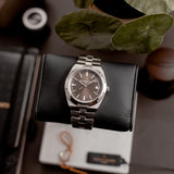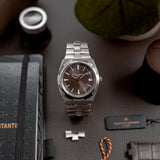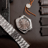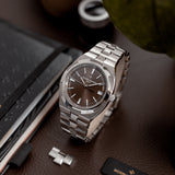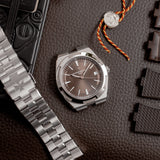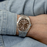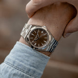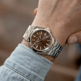 The Chestnut, brown dial is rendered in a smooth, sunburst finish, coming to life when the light falls on it. The dial has only been in production for approximately one year and was replaced by the black dial, making this piece a rare find amongst sport watches, hence a unique enrichment of any collection. The hands and index-markers are manufactured in a modern style and are luminous for superior legibility.