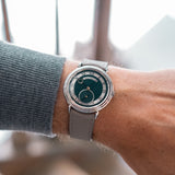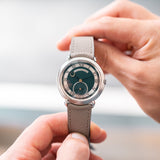 Mr Watchley Grained Light Grey Calf strap comes from the male calfskin and is famous for its resilience and luxurious textured look thanks to the embossment of the grain patterns into the leather. This typical laminated appearance and resilient structure explains why brands like Hermès are fond of this material.
