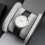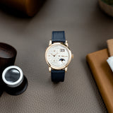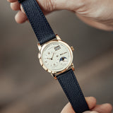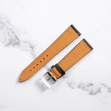 Mr Watchley Grained Midnight Blue calf strap comes from the male calfskin and is famous for its resilience and luxurious textured look thanks to the embossment of the grain patterns into the leather. This typical laminated appearance and resilient structure explains why brands like Hermès are fond of this material.