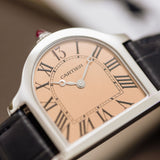 Naturally, the dial is quintessential Cartier, except for the elements that are not. While the presence of black Roman numerals, pomme hands (here in white metal), and a black chemin-de-fer track meet expectations, the rest of its features stray from the norm. It begins with its vertically brushed salmon dial, a light colour that cleverly pairs with the heavy-hitting platinum of the case. Secondly, the 12 Roman numeral, XII, has been replaced with an Arabic '13' numeral, a nod to the historic number 13, Rue De La Paix address. While this addition is consistent with other Rue De La Paix editions such as the Driver, Tortue Monopoussoir, and Tank, it particularly stands out on the Cloche due to the curve of the 3 mirroring the unique curved edge of the Cloche's case. The result is a face that feels distinctly Parisian, considered and poised, like a Haussmann façade viewed from an unexpected angle.