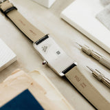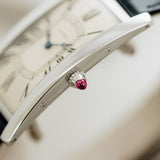 The dial is where the heart of this limited edition of 150 pieces resides. While the dial may appear like a classic Cartier silver, here it's a shade of eggshell cream, a decision that subtly contrasts the overall warmth of the piece. This tone is also a callback to early platinum Cintrée examples, and is balanced out by the svelte Roman numerals and the stylised and central railroad track. While not as seldom seen as may be assumed, using blued pomme watch hands for Tanks is always a delight that overloads the allure. Tying the entire appearance of this romantically realised Cintrée is a black alligator strap.