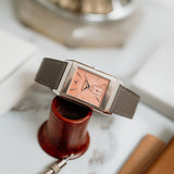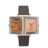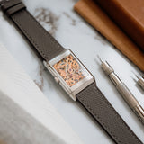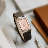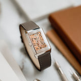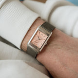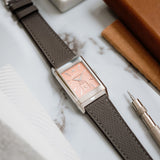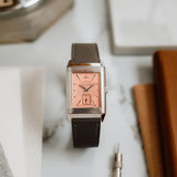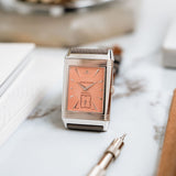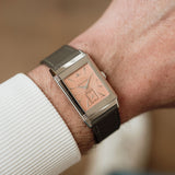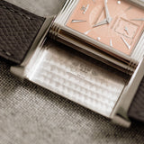 The white gold case frames a dial of pastel salmon hue, a tone that feels both delicate and quietly striking. This softness is contrasted by applied white gold dagger indexes and dauphine hands, bringing a sharp, architectural edge that is unmistakably Art Deco. The interplay between line and curve is central to the design: angular markers meet flowing guilloché, while the rectangular form of the case is softened by gently curved lugs and subtly vaulted sides.