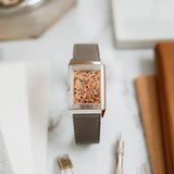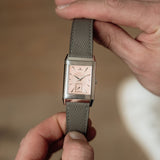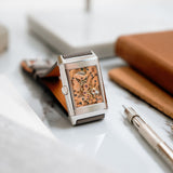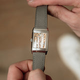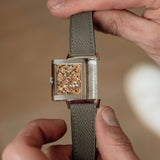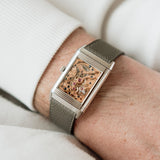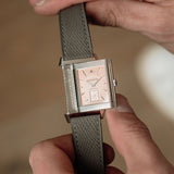 With its Grand Taille proportions, the Reverso Art Deco carries a confident presence on the wrist. Its rectangular form gives it visual substance, yet the refined execution and soft tonal palette ensure it never feels overbearing.
