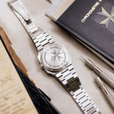 Released at the inaugural period for luxurious takes on sports watches, this Vacheron Constantin Chronomètre Royal 2215 is presented in superb condition from its clean case bevelling to each individual vertically brushed bracelet link. Right off the bat, the 2215 is here to make a statement with its elongated octagonal case shape characterised by its seemingly never-ending vertical sides and short but sweet scalloped corners. Eye-catching bevelling offsets the beautifully defined vertical brushing throughout the case; a finish that seamlessly extends to its integrated steel bracelet. Comprised of a three-link design, the 2215’s bracelet subtly tapers down to the brand’s Maltese cross-signed original folding clasp. Adding further emphasis to the quality of the external bevelling is its matching bezel complete in a high polish. Firmly set within the parameters of the case, this stepped concave bezel mirrors the overall shape of the watch whilst simultaneously reducing the perceived appearance of all the steel.