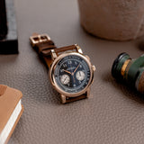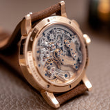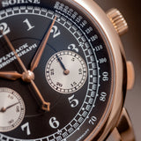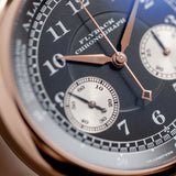 This is only further enhanced by the black oxidized silver dial with sterling silvered sub-dials (each offering a unique railway-track scale) creating a contrasting design and offering perfect legibility. The dial features 18-carat rose gold alpha-style hour and minute hands, a counterweighted needle style chronograph hand, a pair of small blued hands for the 30-minute chronograph register (four o’clock), and for the running seconds register (at eight o’clock). Painted white Arabic numerals occupy the centralised surround of the dial – a hallmark for the 1815 series.