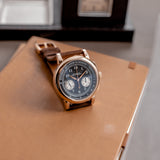 But the most distinctive design element of this delightful timepiece is the peripheral, railway-track minute scale with an outboard pulsation scale for taking pulses in conjunction with the chronograph. The dial furthermore offers a remarkable perception of depth, created by showcasing different levels: the flange, the hour-track and separate sub-dials that are sunk into the dial.