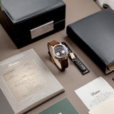 This rare A. Lange & Söhne Lange 1815 Chronograph 401.031 timepiece is in very good condition with only hairlines signs of wear and has perfect mechanical functioning. It comes complete as a full set, including inner and outer boxes and warranty papers, manual, wallet. The piece is also accompanied by an additional and original unworn Lange & Söhne watch strap and it was never polished. It was sold by Cottrills (Now Prestons) jewellers in 2008 and and is a one owner only watch. The set comes also with a purchase receipt from Prestons.