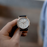 One of the most noticeable elements of this stark white dial is the amount of depth. Looking at the piece head-on, this isn’t overtly apparent, however, all it takes is a turn of the watch and instantly the multi-layered dial shows itself. A reoccurring theme is the application of bright, fresh blue seen throughout the font and hands. This is first noticeable surrounding the dial where a fan favourite from early 1815 Chronograph’s is found: a pulsometer. This shares the periphery of the dial with the ‘A. Lange & Söhne’ signature proudly being displayed at the 12 o’clock position. Taking one step further, we arrive at the heart of the dial which accommodates three different layers. Firstly, a railway seconds track with traditional Saxon porcelain dots provides superb legibility to what could easily be a cluttered dial. Fortunately, the 1815 Chronograph is far from that, as the traditional elements have been approached from an engineering perspective. Large, Arabic numerals (also complete in the refreshing tone of blue) are only interrupted at three and nine to allow for the two, slightly off centred concentric circled sub-dials. The left sub-dial keep track of the running seconds whereas the right sub-dial measures elapsed minutes through a jumping minute hand.