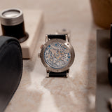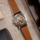 Often referred to as the little brother of the Datograph, the 1815 Chronograph is the perfect intersection of haute horology meets realistic, daily usability. The example seen here represents an exceptional example of the Boutique Edition. Encased in stealthy white gold, this 39.5mm wide watch features signature notched lugs complete in a polished finish with accompanying bevelling and a gentle downturn. The case is skillfully constructed with an overriding air of simplicity. Gracefully squared off chronograph pushers occupy the right-hand side of the case with its suitably sized, easy to operate crown to match. A step-down bezel design directly plays into the hands of wearability and dynamism, setting the stage with ease for the extraordinary dial.