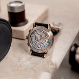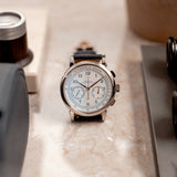 The 1815 Chronograph "Boutique Edition" is a proportional masterclass from A.Lange & Söhne. On paper, it delivers a sweet spot in width, height and length and in person these measurements translate effortlessly. The prominent lugs confirm the unequivocal Lange design language with the added bonus of wrist hugging properties. The silver base of the dial is an exceptional backdrop enabling the commanding blue dial details to come alive and in many lights, shift to a black tone.