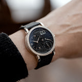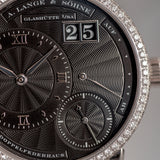 The dial of a Lange 1 is always the sweetheart of the timepiece, and with this covert esque example, it's no different. Crafted from solid gold, asymmetrical, and de-centralised, the dial is embellished with ornate hand-crafted guilloché patterns that honour each function's harmonious nature and purposeful placement. Blending a barley guilloché pattern for the base with a guilloché present in the time-telling dials, this addition of depth and illustrious refinement accentuates the sophistication of the Lange 1's personality. Nevertheless, despite its traditional techniques, the watch's personality is hugely dictated by its superior stealthy dial colour. Comprising of quarter Roman applied numerals, multi-faceted Alpha hands, diamond hour markers, and a robust framing for its matching black double date aperture, the dial furniture matches the white metal exterior to create a monochromatic yet nuanced appearance. Likewise, the running seconds hand and the power reserve indicator match to conclude this piece's colour palette. The dial is finished further with the A.Lange & Söhne arcing signature along with 'Glashütte i/SA' ('in Saxony') underneath, and the readings for the power reserve and 'Doppelfederhaus', which references the twin-barrel set-up of the movement.