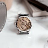 The reference 101.062 is generally recognised as the quintessential Lange 1 platform of the two due to its conventional case proportions and classic execution. The watch measures 38.5mm in width and features the signature notched lugs in a polished finish with accompanying beveling and a gentle downturn. The solid platinum case is skillfully constructed with an overriding air of simplicity. A rounded bezel directly plays into the hands of wearability and dynamic elegance. Simply put, this is an archetypal Lange 1 exterior, from its tasteful dimensions to its understated beauty.